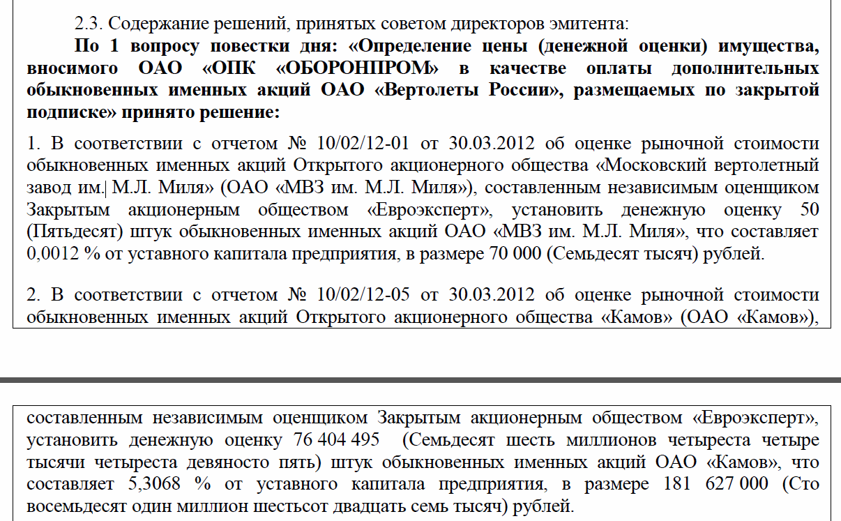 Эта оценка для оплаты акций Вертолетов России, т.е. чтобы Оборонпром купил на них новые бумаги ВР по 622 рубля.