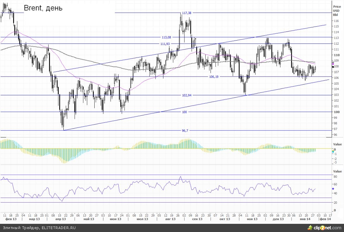 Что касается ситуации на рынке черного золота, то все беды с рублем проходят на фоне абсолютного флэта в котировках нефти. Практически с самого начала января фьючерсы на североморскую Brent лишь болтаются в пределах очень узкого коридора. Снизу расположена поддержка на $105-106 за баррель, сверху сопротивление на $109-110.