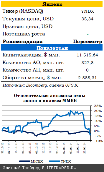 Наша рекомендация по акциям «Яндекса» на конец 2013 года реализовалась с превышением, и мы отправляем оценку справедливой стоимости компании на пересмотр. Сохраняем умеренно-позитивный взгляд на компанию.