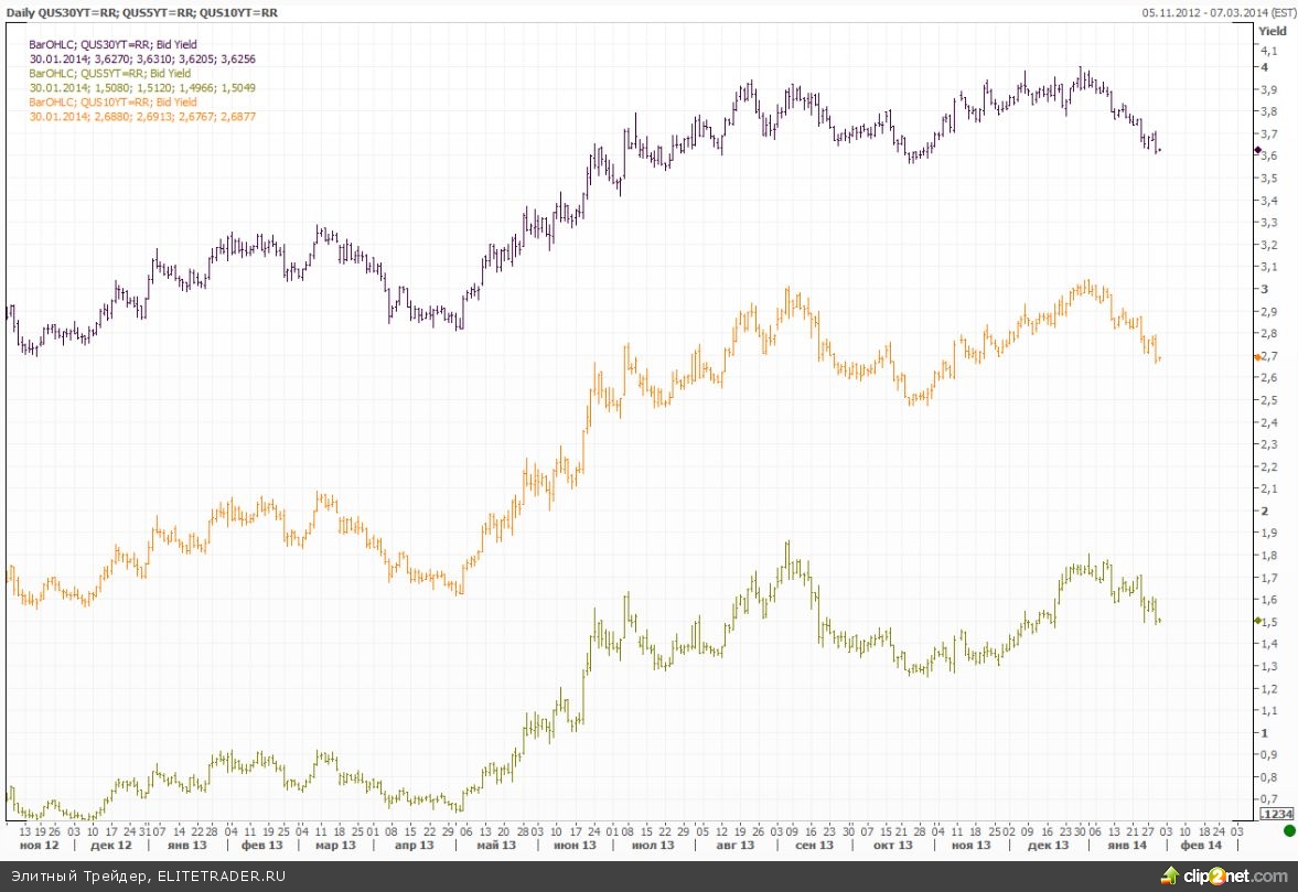 Рынок американского госдолга отреагировал на решение ФРС ростом, хотя здесь сложно говорить непосредственно о реакции на действия регулятора при напряженной ситуации на развивающихся рынках и др. факторах, в числе которых отметим вчерашний успешный аукцион по продаже 2-летних облигаций с плавающей процентной ставкой. Коэффициент Bid to Cover при размещении бумаг на $15 млрд. оказался даже выше чем у годовых векселей на уровне 5,67. Доходность составила 0,045%, что ниже доходности трехмесячных векселей на последнем аукционе.