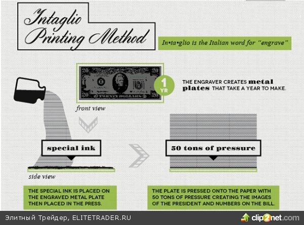 Пресс весом 50 тонн прижимает печатную форму к бумаге, создавая портреты президентов и цифры на банкноте.