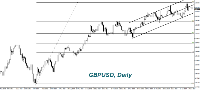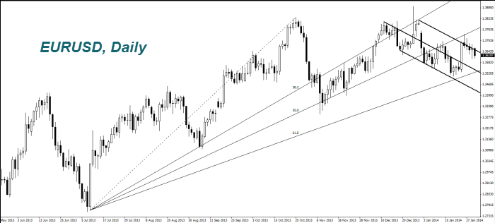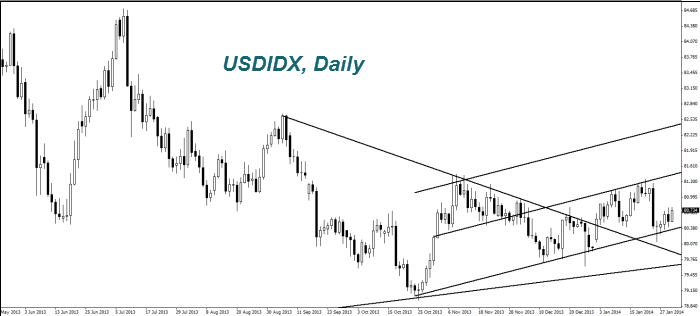 Вчера ФРС сократила объем выкупа американских гособлигаций еще на $10 млрд. до $65 млрд. в месяц. Учетные ставки не изменились. Следующее заседание ФРС состоится 18-19 марта. Реакция рынка Форекс была вялой. Вчера индекс доллара (USDIDX) вообще понизился и лишь сегодня наблюдается его повышение. Напомним, что после первого сокращения выкупа ФРС 18 декабря, индекс доллара сразу вырос на 0,7%. Мы полагаем, что в нынешней слабой динамике американской валюты виновато снижение привлекательности активов. В этом году фондовые рынки корректируются вниз после бурного прошлогоднего роста. Индекс SnP 500 с начала 2014 года снизился на 3,9%. Тогда как в прошлом году его рост составил 25%. Из-за паники на развивающихся рынках доходность американских десятилетних гособлигаций сейчас опустилась до 2,7% с 3% в середине декабря. Тем не менее, мы полагаем, что решение ФРС ещё окажет поддержку доллару. Однако его курс будет сильнее реагировать на макроэкономические факторы, общую ситуацию на рынке Форекс, а также на сигналы технического анализа.