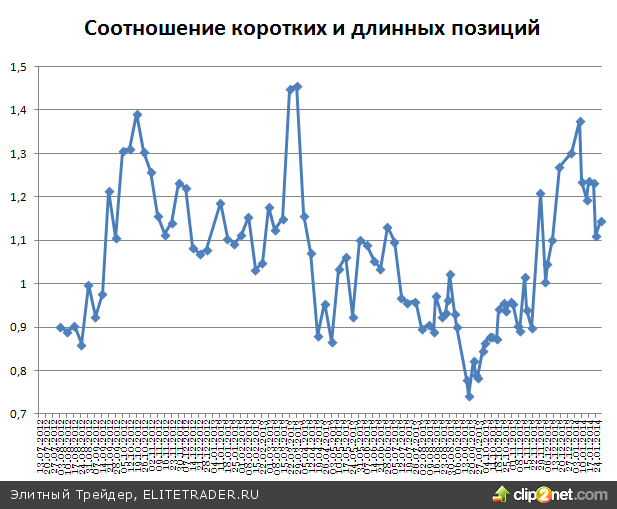 Обратив внимание на открытые юридическими лицами позиции по фьючерсу на индекс, можно заметить, что настроения крупных игроков с конца прошлой недели изменились в сторону продаж. Соотношение коротких и длинных позиций теперь составляет 1,145 против 1,11 четырьмя днями ранее.