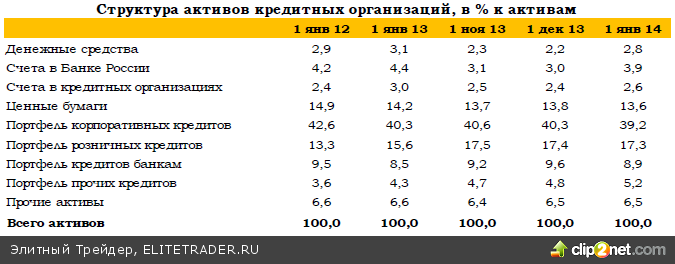 Сокращение объема кредитов, предоставленных реальному сектору и финансовым организациям, сказалось на общей величине портфеля кредитов. Вследствие этого доля выданных банками кредитов в активах в декабре опустилась с 72,1% до 70,6%. Полученные данные легко поддаются интерпретации, если их сопоставлять с данными за предыдущий месяц. Так, уменьшение объема выданных кредитов банкам сразу на 5,3% является возвратом к норме после ноябрьского всплеска на 6,6%. Сокращение портфеля кредитов нефинансовым организациям на 0,7% также объясняется сильными данными по кредитованию месяцем ранее, когда был зафиксирован прирост на 1,6%. Отчасти на снижение номинального объема кредитования сказались сделки по секьюритизации ипотечных портфелей ВТБ24, банка «Абсолют» и ряда других общим объемом порядка 60 млрд руб. Зампред Банка России Михаил Сухов в числе возможных причин снижения корпоративного кредитования назвал улучшение ситуации с ликвидностью у крупных заемщиков. По итогам года объем выданных бизнесу кредитов составил 12,7%, как и за предыдущий год.