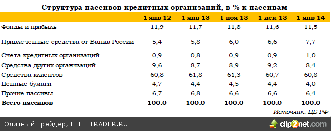 В роли основного фактора наращивания ресурсной базы вновь выступили привлеченные средства ЦБ России. Привлеченные у регулятора средства увеличились за декабрь на 19,7%, составив уже 7,7% всех пассивов. Противоположная тенденция наблюдалась со средствами, полученных у других кредитных организаций. Их доля в пассивах уменьшилась с 9,2% до 8,4%, в абсолютном выражении сократив чуть ли не вдвое объем поступлений средств от Банка России.