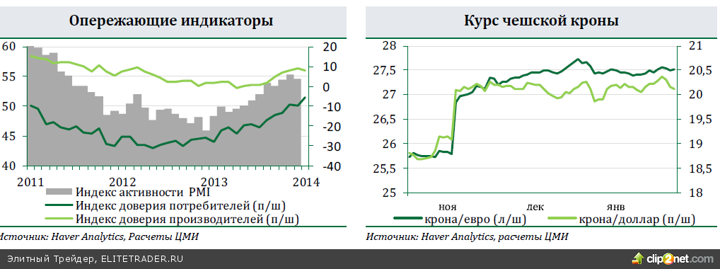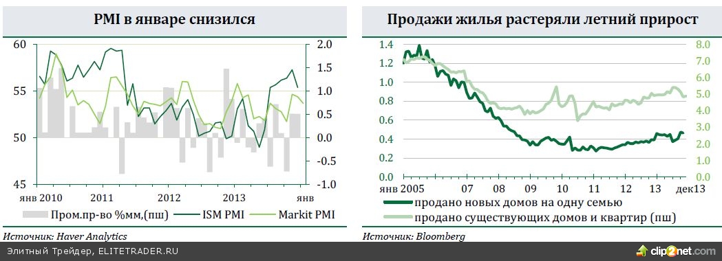Опубликованные на неделе индикаторы ожиданий практически не изменились с прошлого месяца. На индикатор бизнес-ожиданий по Германии ZEW, похоже, не повлияли данные о незначительном росте за 2013 год. Оценка текущего состояния снова «зашкалила»: 41,2 при ожиданиях 35. Оценка ожиданий незначительно снизилась с 62 до 61,7. Предварительные оценки PMI в услугах и обработке также немного подросли, составив 53,6 и 56,3. Предварительные PMI в обработке и услугах во Франции составили 48,6 и 48,8, по-видимому, отреагировав на амбициозные заявления президента.
