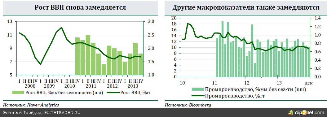 Как мы и ожидали, рост экономики Китая в 4 квартале снова замедлился. ВВП вырос на 7,7%гг (7,8% в 3 квартале), а рост к предыдущему кварталу за вычетом сезонности составил 1,8%кк (после 2,2% в 3 квартале). За 2013 год в целом экономика выросла на те же 7,7%. Ничего драматичного в таком замедлении 4 квартала пока нет, правительство декларировало готовность потерпеть и 7,5% по итогам года.