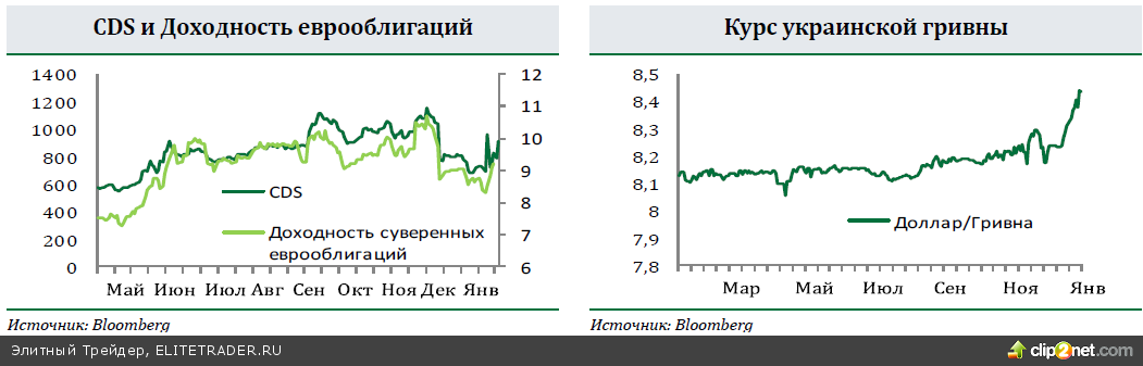 Рост политической неопределенности в стране имеет ярковыраженные экономические последствия. Во-первых, поступление очередного транша кредита от России и значительная скидка на поставляемый газ напрямую связаны с вектором внешнеэкономической политики Киева, что сужает простор для политического маневра. Во-вторых, международные инвесторы и финансовые рынки резко отреагировали на эскалацию конфликта на Украине. Доходность десятилетних государственных еврооблигаций выросла до уровня 9,2%, прибавив 0,9пп за неделю. При этом существенно возросла стоимость пятилетних кредитно-дефолтных свопов Украины (CDS), прибавив в цене около 30% и превысив 910 пунктов. Значительная турбулентность на рынке привлечения капитала сопровождалась ослаблением украинской гривны. Национальная валюта подешевела на 2,4% до 8,43 гр. за доллар. Дальнейшая динамика процентных ставок, доходностей и национальной валюты в краткосрочной перспективе будет зависеть от способности властей добиться политической стабилизации.