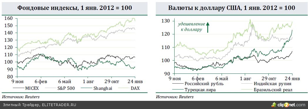 Неделя отмечена значительным оттоком капиталов с фондовых рынков, особенно развивающихся. Основной причиной, видимо, следует считать статистику, показавшую замедление роста в Китае в 4 квартале. Этот отток сопровождается значительным обесценением валют соответствующих стран. Бразильский реал за неделю упал к доллару на 2,4%, индийская рупия - на 1,8%, а турецкая лира - сразу на 4,5%. В плюсе из основных фондовых рынков только, как ни странно, китайский.