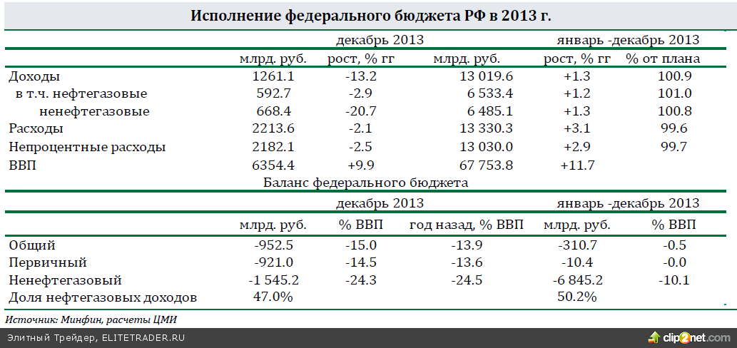 Дефицит федерального бюджета в 2013 г. составил 0,5%ВВП. Принятые в мае изменения бюджетного правила позволили направить 628 млрд руб. дополнительно собранных нефтегазовых доходов на финансирование дефицита бюджета. В результате, ненефтегазовый дефицит бюджета составил 10,1%ВВП, что на 0,2 п.п. ниже уровня прошлого года, но выше запланированных в начале года 9,7%ВВП. Нефтегазовые доходы по- прежнему формируют чуть боле половины бюджетных доходов.