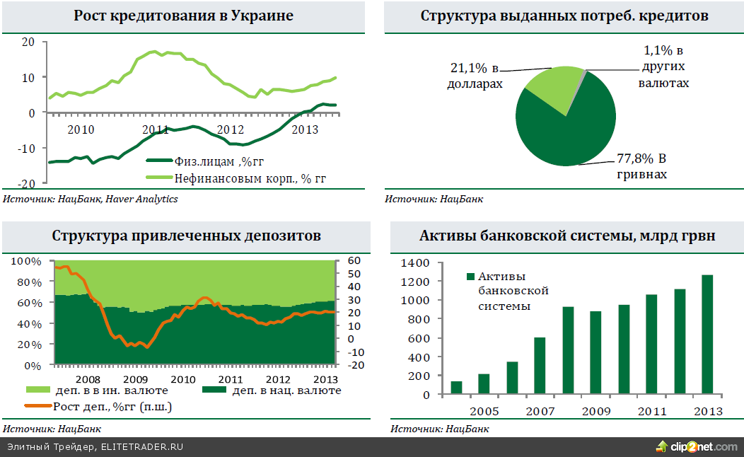 СОСЕДИ: В Украине сокращается прибыль банковской системы; растет доля депозитов в нац. валюте из-за разницы в ставках; рост кредитования юридических лиц опережает рост кредитования населения. В 2013 г. рост ВВП в Беларуси составил 0,9%гг; розничная торговля выросла на 18,2%гг; белорусский рубль продолжает плавно дешеветь. Валовый внешний долг Казахстана вырос на 8% за первые 3 кв. 2013; государственный долг составляет около 3% от ВВП