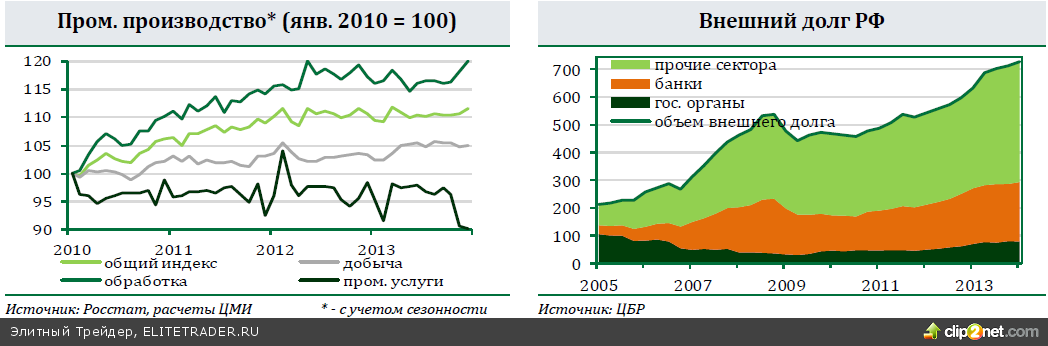 РОССИЯ: Внешний долг в 2013 г. вырос на 15%гг, основной прирост у компаний. Пром. производство выросло на 0,3%гг в 2013 г., что выше консенсус-прогноза, но, вероятно, рост в 2014 г. останется вялым. На этой неделе выходят макроэкономические данные за 2013 год – приятные сюрпризы маловероятны.