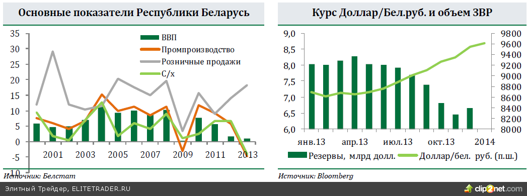 По итогам 2013 года экономика Беларуси выросла на 0,9%гг, что значительно отличается от официального прогноза правительства Республики- 8,5%гг. ВВП остается в зоне роста в основном за счет торговли (18,2%гг в 2013). Двузначные темпы увеличения реальных располагаемых денежных доходов населения (16,1%гг в январе-ноябре) поддержали сектор потребления и позволили экономике избежать рецессии в 2013 году. Подобная ситуация объясняется проводимой политикой белорусских властей, направленной на стимулирование потребительского спроса (увеличение зарплат, пенсий, стипендий и тд). Однако у такой стратегии «поддержки» экономики есть и обратная сторона. По итогам года инфляция составила 18,3%гг, что существенным образом повлияло на усиление девальвационных ожиданий населения. Более того, рост денежных доходов происходит в условиях сокращающегося промышленного производства (- 4,8%гг в 2013). Это способствует ускорению импорта и приводит к дальнейшей разбалансировке экономики. Для экономической стабилизации белорусским властям необходимо ужесточить монетарную политику и перестать стимулировать потребительский спрос. Только при таких условиях возможны замедление инфляции и ослабление давления на платежный баланс страны.