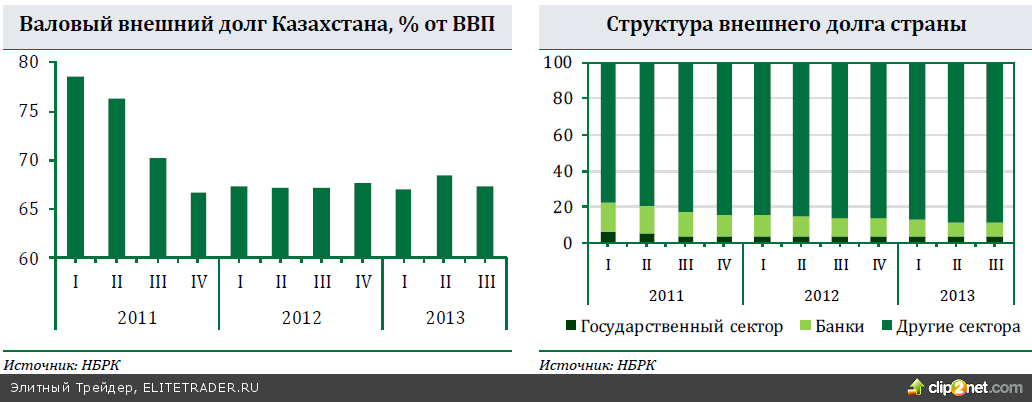 По данным Национального банка Казахстана, совокупный внешний долг страны за первые три квартала 2013 г. вырос на 8% и составил 148 млрд долл. Отношение внешнего долга к ВВП, включая межфирменную задолженность, составило 67,4%, без нее - 34,3%. Страна тратит на обслуживание совокупного долгового бремени около 14-15% от ВВП ежегодно. При этом задолженность банковского сектора остается значительной. Несмотря на то, что за 9 месяцев долг кредитных организаций сократился на 10%, его объем превышает 11 млрд долл. (около 5% от ВВП страны).