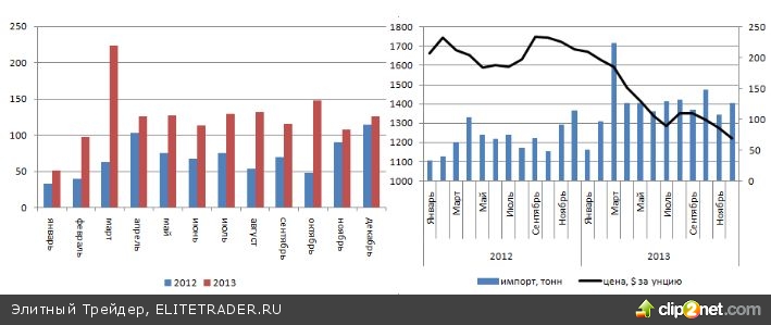 Пик пришелся на март прошлого года, когда было импортировано 223 тонны драгоценного металла. Очевидно, что показатель эластичен к цене: резкое падение последней вызывает его рост. Повышение котировок фьючерсов в январе позволяет предположить, что в этом месяце на территорию страны было ввезено около 100 тонн золота. С учетом того фактора, что потребители постепенно привыкают к текущим ценам, можно оценить величину чистого импорта в 2014 году в 700-750 тонн, что выше показателя, зафиксированного в 2012 году (557,3 тонны).