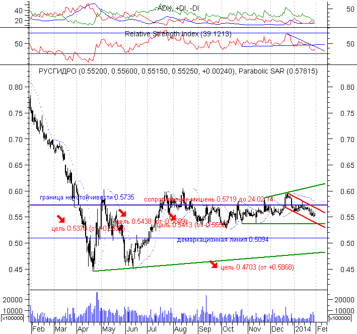 Двухмесячный понижательный коридор по акции Русгидро вернул ее на уровень психологической поддержки 0.55. Пробой ее грозит вывести акцию в район 0.5378-0.5438. Глобальные риски падения измеряются до 0.4703.. Однако по акции есть потенциал положительных новостей. Минэнерго предлагает постепенно либерализовать цены на мощность для ряда ГЭС в Сибири с 1 апр.2014г. Это мера может привести к увеличению доходов Русгидро на 1 млрд руб., так как регулируемые цены на мощности ГЭС сейчас занижены против рыночных. Но пока на дневном графике акции наблюдается некоторое преобладание негативного фона.