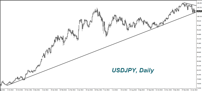 Ночью вышли данные по инфляции в Японии за декабрь. Она выросла до максимума за последние пять лет 1,6% в годовом исчислении. Тем не менее, укрепление (снижение на графике) иены (USDJPY) сейчас не очень велико. Банк Японии заявил, что в январе иена и так укрепилась на 2,5% впервые за шесть месяцев ослабления. По его мнению, макроэкономическая информация уже учтена в текущем курсе. Мы, в свою очередь, полагаем, что скорее всего японская валюта будет находиться в нейтральном тренде до апреля. Подробнее об этом вы можете прочитать в наших предыдущих обзорах. Однако, если повышение налога с продаж, а также действия Банка Японии принесут ожидаемый эффект, то мы не исключаем дальнейшего ослабления иены (продолжения роста на графике) в нынешнем году в район 110. Мы не исключаем, что швейцарский франк (USDCHF) может повторить ослабление иены (рост на графике). Так как обе эти валюты активно используются в операциях curry trade.