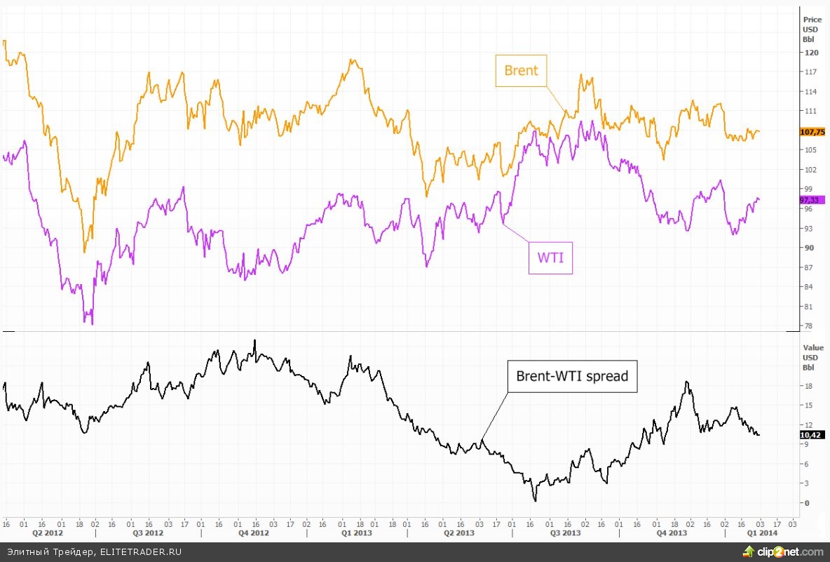 На конец недели мартовские нефтяные фьючерсы марки Brent находятся вблизи отметки в $107,7. С прошлой пятницы они упали всего на 0,2%, стоимость WTI выросла до $97,8, повысившись на 1,2%. Спрэд между марками сократился и в данный момент составляет около $9,9. Рост разницы в стоимости сортов отчасти обеспечен экстремально холодной зимой, а также запуском нефтепровода Keystone XL, который соединяет Кушинг (Оклахома) и побережье Мексиканского залива.