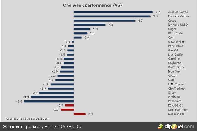 В сельскохозяйственном секторе картина была смешанная: на рынках основных зерновых культур, например пшеницы, продолжились продажи, зато повышение цен на какао и кофе обеспечило высокий результат для сектора выращиваемых товаров по итогам недели.