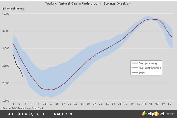 После непрерывного роста цен на природный газ на протяжении первой половины января на рынке возобновились сильные колебания, после которых многим трейдерам пришлось зализывать раны. Трижды за эту неделю диапазон дневной торговли достигал 12%, в результате чего волатильность достигла 100%. Два дня подряд цена держалась в районе 5,5 долларов за терм, но затем быстро опустилась ниже пяти долларов. Повышение цен было вызвано резким сокращением запасов в условиях постоянно растущего спроса, учитывая тот факт, что объемы добычи в этот период года невысокие. Прогнозы потепления в феврале привели к резкому развороту позиций, и по контракту NGH4 было зафиксировано самое сильное двухдневное падение цен за период более четырех лет.