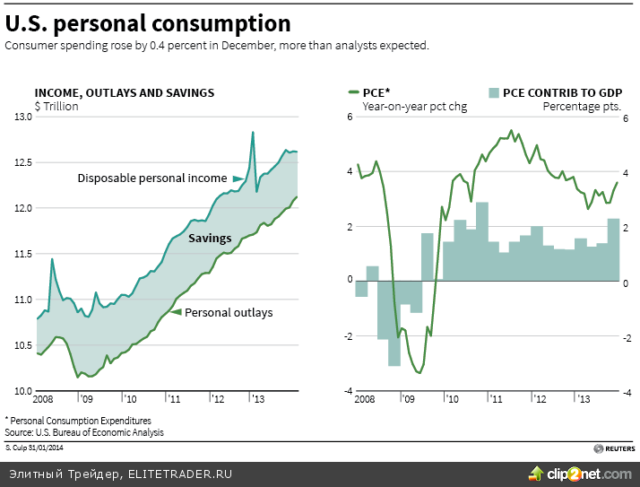 Месячный обзор по расходам/доходам потребителей указал на замедление темпов роста расходов с 0,6% до 0,4% в декабре, тогда как ожидалось 0,2%. В то же время доходы остались без изменений, при консенсусе роста на 0,2%. Некоторое ускорение роста наблюдалось в инфляционных показателях, в частности PCE Price index отслеживаемый ФРС в своей политике, вырос на 0,2% в месячном выражении и на 1,1% в годовом, что впрочем остается далеким уровнем от целевых 2%.