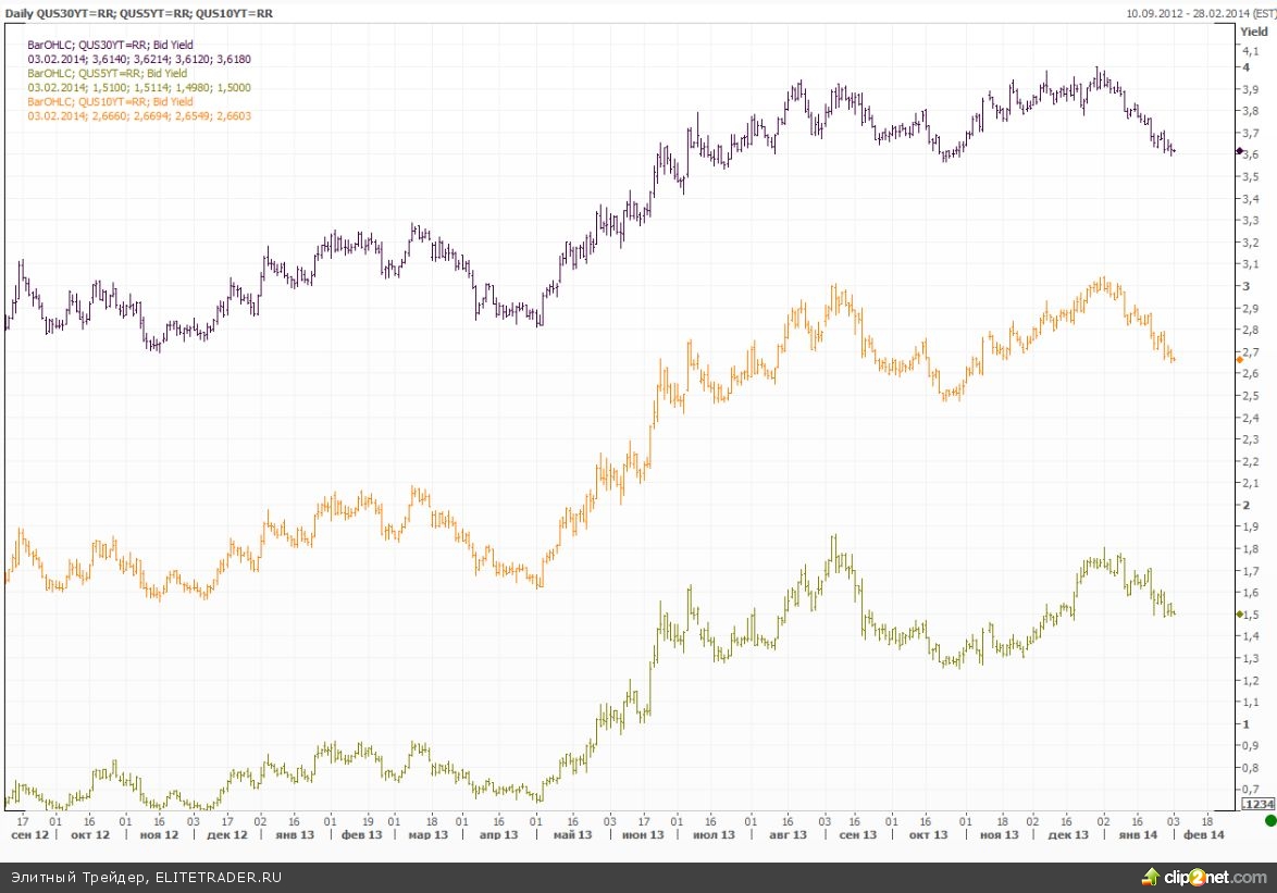 В целом январь стал для американского рынка акций худшим месяцем с мая 2012 года. При как таковой перегретости рынка, мы наблюдаем, по всей видимости, бегство инвесторов в безрисковые инструменты на фоне охлаждающих пыл инвесторов данных по китайской экономике, бегства капитала с развивающихся рынков, ослабления валют развивающихся стран, и соответствующего укрепления доллара. Доходность американских казначейских облигаций на этом фоне продолжает снижаться притом, что Фед на прошлой неделе объявил о сокращении покупок данного вида активов еще на $5 млрд.