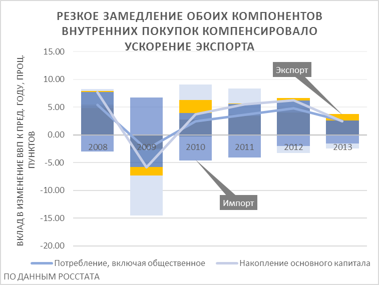1. С точки зрения конечного спроса (видим это на графике справа) видим резкое замедление обоих компонентов внутренних покупок, как потребления (причем если реальные потребительские расходы домохозяйств только замедлились, то потребление со стороны сектора госуслуг и некоммерческих организаций, обслуживающих население, даже и сократилось), так и инвестиций. Это довольно естественно после потребительского и инвестиционного бума 2011-12 годов, когда темпы прироста потребительских и инвестиционных расходов достигали 8 и 9% соответственно. Негативный вклад инвестиционного спроса вызван также свёртыванием инвестиционных программ госкомпаний (точнее, естественных монополий) в ответ на сокращение инвестиционных расходов госбюджета и грядущее замораживание тарифов.