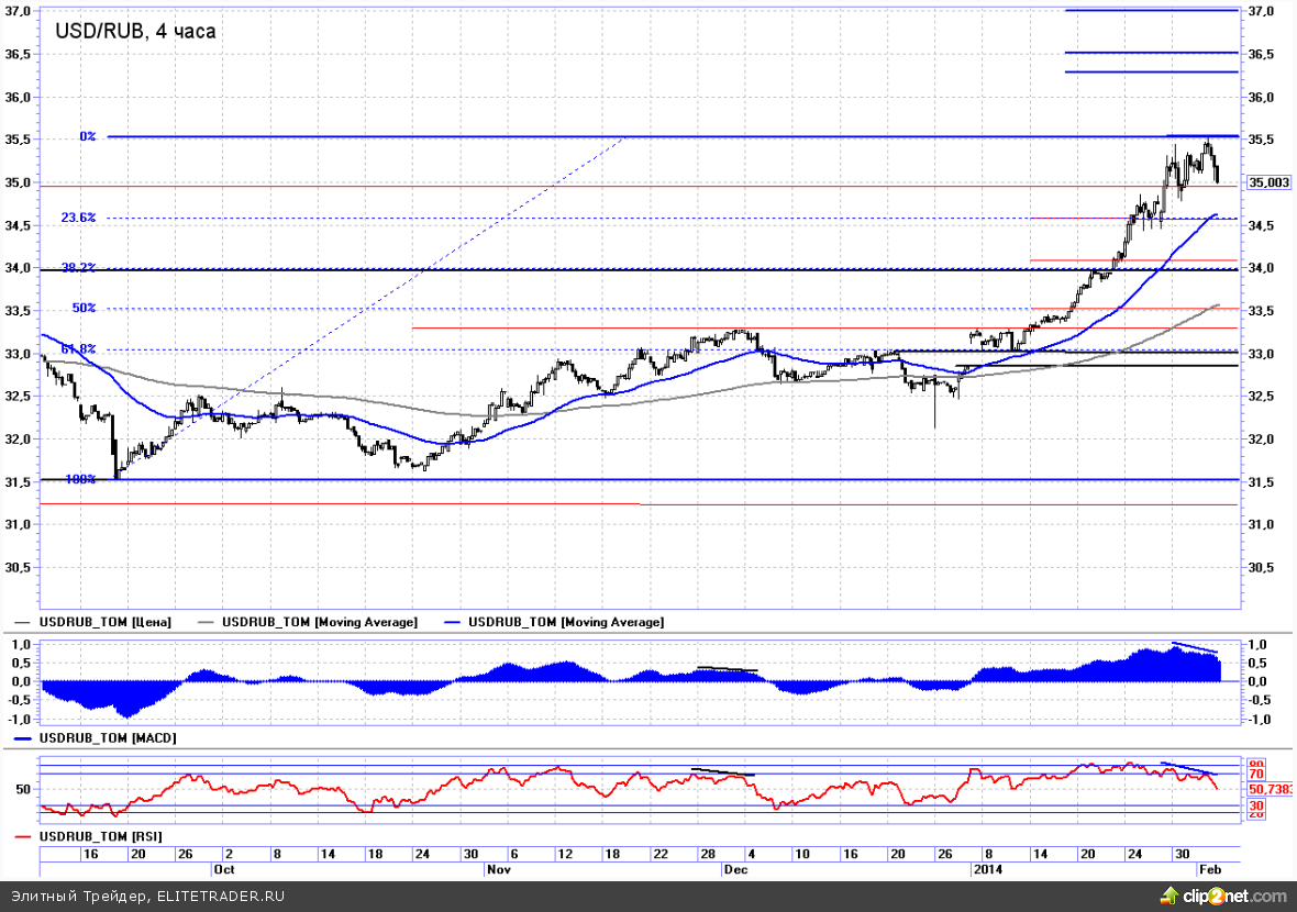 В качестве положительного момента отметим локальную разворотную формацию, которая образовалась на графике пары доллар/рубль. Во вторник курс снова протестировал многолетние максимумы, после чего начал быстро откатываться вниз. В ближайшей перспективе коррекция к росту, скорее всего, будет продолжена. На это нам намекают классические медвежьи дивергенции на осцилляторах. В качестве промежуточных поддержек выделяем области 34,5-34,6 и 34-34,1. Что касается долгосрочных перспектив, то по-прежнему не теряют актуальности расчетные цели в районе 36,5-37.