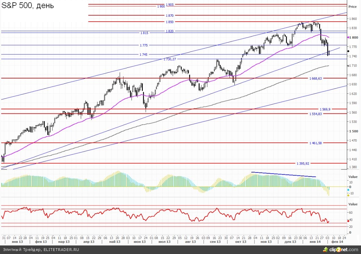 За океаном ситуация на рынке акций развивалась по самому предсказуемому сценарию. После мощного провала понедельника вчера покупателям удалось отыграть часть потерь. Индекс широкого рынка SnP 500 закрывался в районе 1755. Общий взгляд на текущую картину остается прежним. Зона 1730-1740 выступает точкой опоры, которая отделяет нас от дальнейшего погружения к уровням 1670 и 1650. Что же касается бычьего сценария и возврата к движению в сторону максимумов, то для этого индексу необходимо вновь закрепляться выше 1800, во что пока с трудом верится.