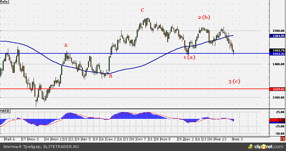 В свою очередь негативный сценарий также имеет неплохие шансы на успех. Он предполагает, что коррекционная модель ABC еще не завершилась. Сейчас мы наблюдаем волну С, которая завершиться в районе 1340. Для реализации данного сценария необходим пробой вниз уровня 1430.