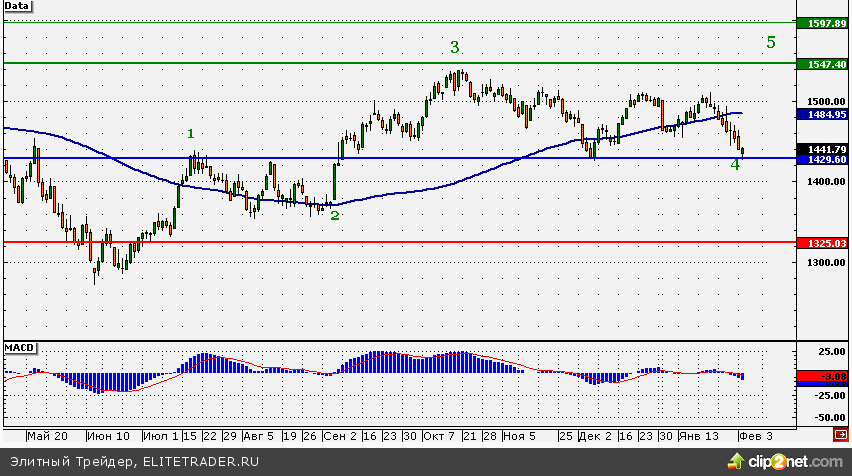 Позитивный сценарий предполагает, что в районе 1430 мы видели окончание коррекционной волны 4, и сейчас началась импульсная волна роста, которая закончится не ранее чем на уровне 1540. Сигналом для отмены данного сценария послужит уход ниже 1430.