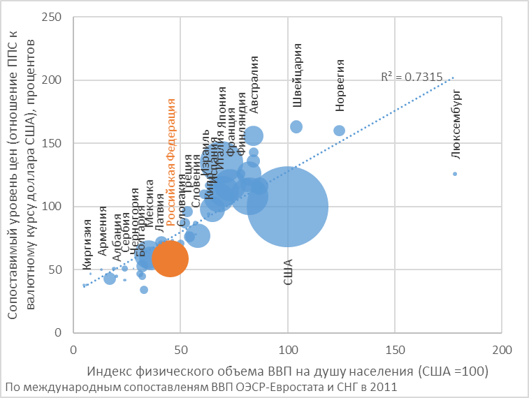 2. Это была присказка. Не собирающимся писать диссертацию на тему обменных курсов, погружаться в этот океан ссылок, конечно, совсем не обязательно и ни к чему. Чувствуется, что для первого знакомства с предметом надо бы что-то понагляднее и попроще. Посему давайте рассмотрим простейшую иллюстрацию, основанную на завалявшемся у меня и составленном по иному случаю (но у хороших хозяев - всё в дело!) графике из результатов последних (за 2011) межстрановых сопоставлений ОЭСР-Евростата (с мостом, перекинутым на 9-ку стран СНГ через 2-уликого Януса - Россию, принадлежащую сразу обоим сообществам – и «цивилизованному миру», и СНГ, и соответственно, участвовавшую сразу в 2-х сопоставлениях). Я, кажется, что-то такое уже писал тут раз несколько раз, но поскольку никто не обязан помнить, что и где я писал (да я и сам плохо помню), то имею право повториться.