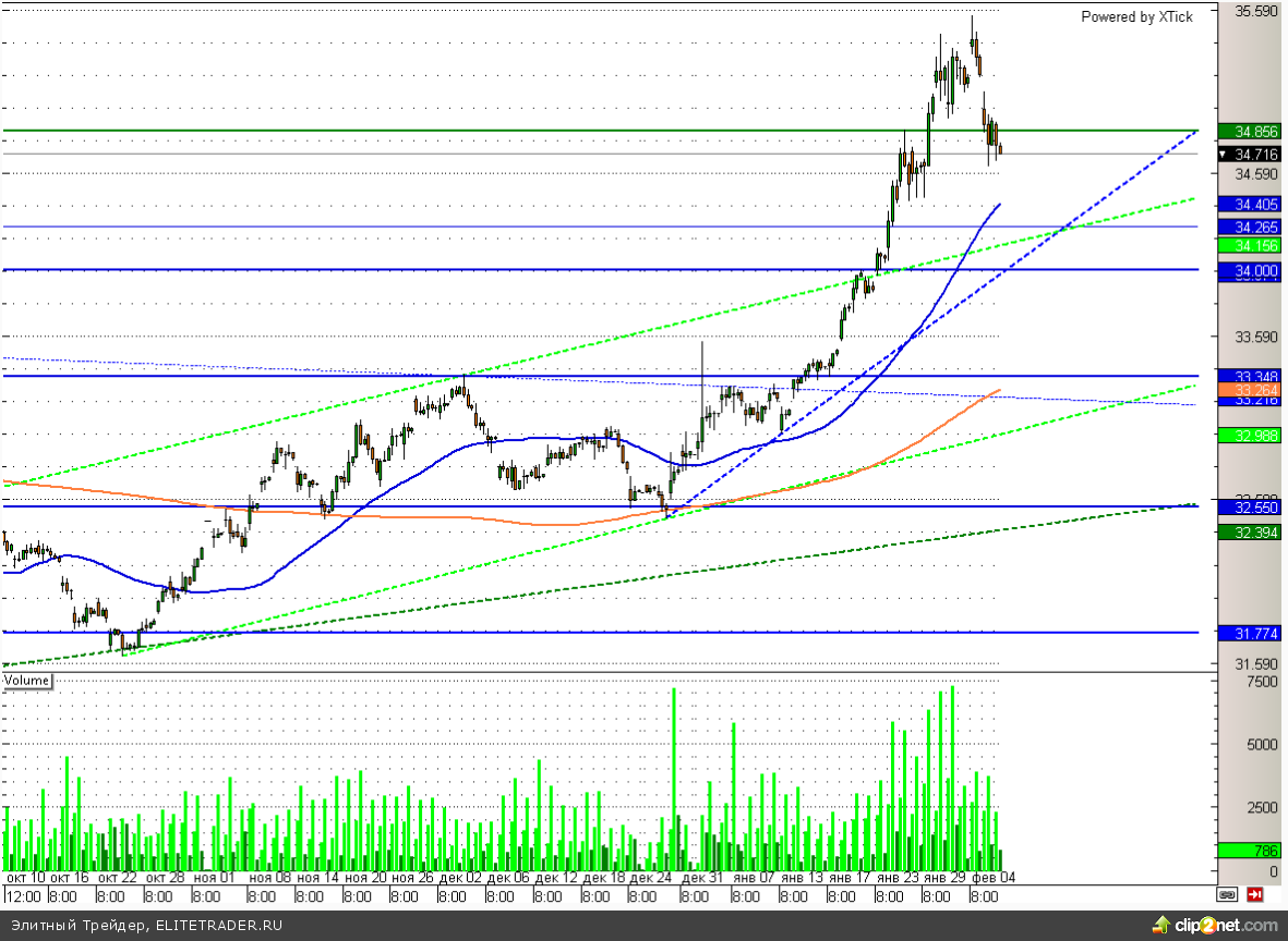 Рубль прибавляет к доллару чуть более 5 копеек. Данная валютная пара еще накануне подошла к крайне сильной поддержке вблизи уровня 34,5. Здесь укрепление российской валюты может на некоторое время приостановиться или даже смениться краткосрочным ростом доллара. Впрочем, фундаментальных предпосылок для этого практически нет, и данное движение будет скорее коррекционным. В дальнейшем укрепление рубля может продолжиться в район 34,3. Дополнительный спрос на валюту РФ создаст предстоящая зимняя Олимпиада, стабильно высокие цены на нефть и краткосрочное увеличение доходов бюджета от существенного ослабления рубля в январе.