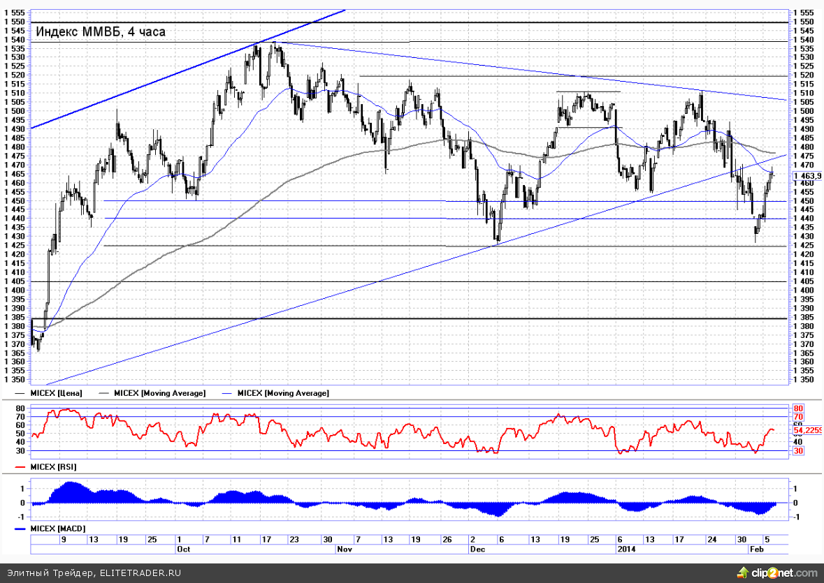 Технически, индекс ММВБ днем ранее уперся в сопротивление 200-дневной скользящей средней, которое сходу пройти не удалось, но вчера этот рубеж был взят и индекс вышел к отметке 1470, тем самым отработав 50%-ую коррекцию к нисходящей волне от январских максимумов. Глядя на часовой таймфрейм, где наблюдается краткосрочный восходящий канал, откат к 1460 напрашивается уже с текущих уровней, но, по всей видимости, сценарий движения в канале не реализуется. С другой стороны выход из него, обозначающий ускорение роста, уже при подходе к 1480, то есть тестировании снизу пробитого ранее 1,5-месячного восходящего тренда может обернуться более внушительным откатом.