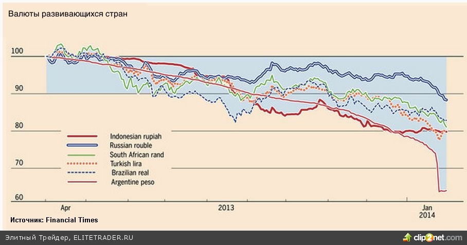 Первый месяц 2014 года стал по-настоящему провальным для российской валюты. Доллар подорожал на 8% и перешагнул отметку в 35 руб., евро достигал 48 руб. Так дешево российская валюта стоила только во время кризиса 2008–2009 гг. Стоит отметить, что рубль оказался не главным аутсайдером среди валют развивающихся рынков. Так, снижение аргентинского песо составляло в моменте более 20%.