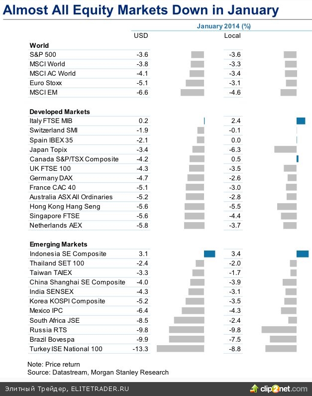 Январь стал одним из худших месяцев для развивающихся рынков за прошедший год. Бегство инвесторов из рисковых активов привело к падению индекса ММВБ на 3,3%, РТС просел на 9,8%.