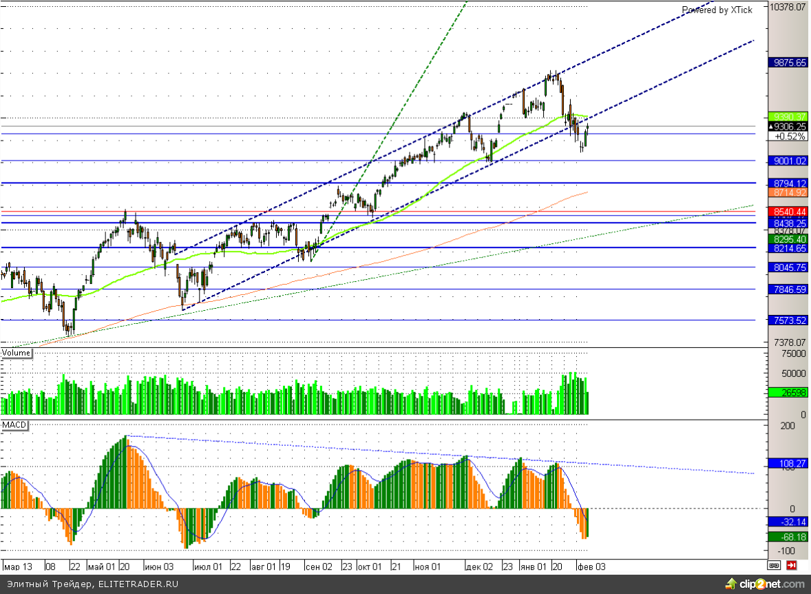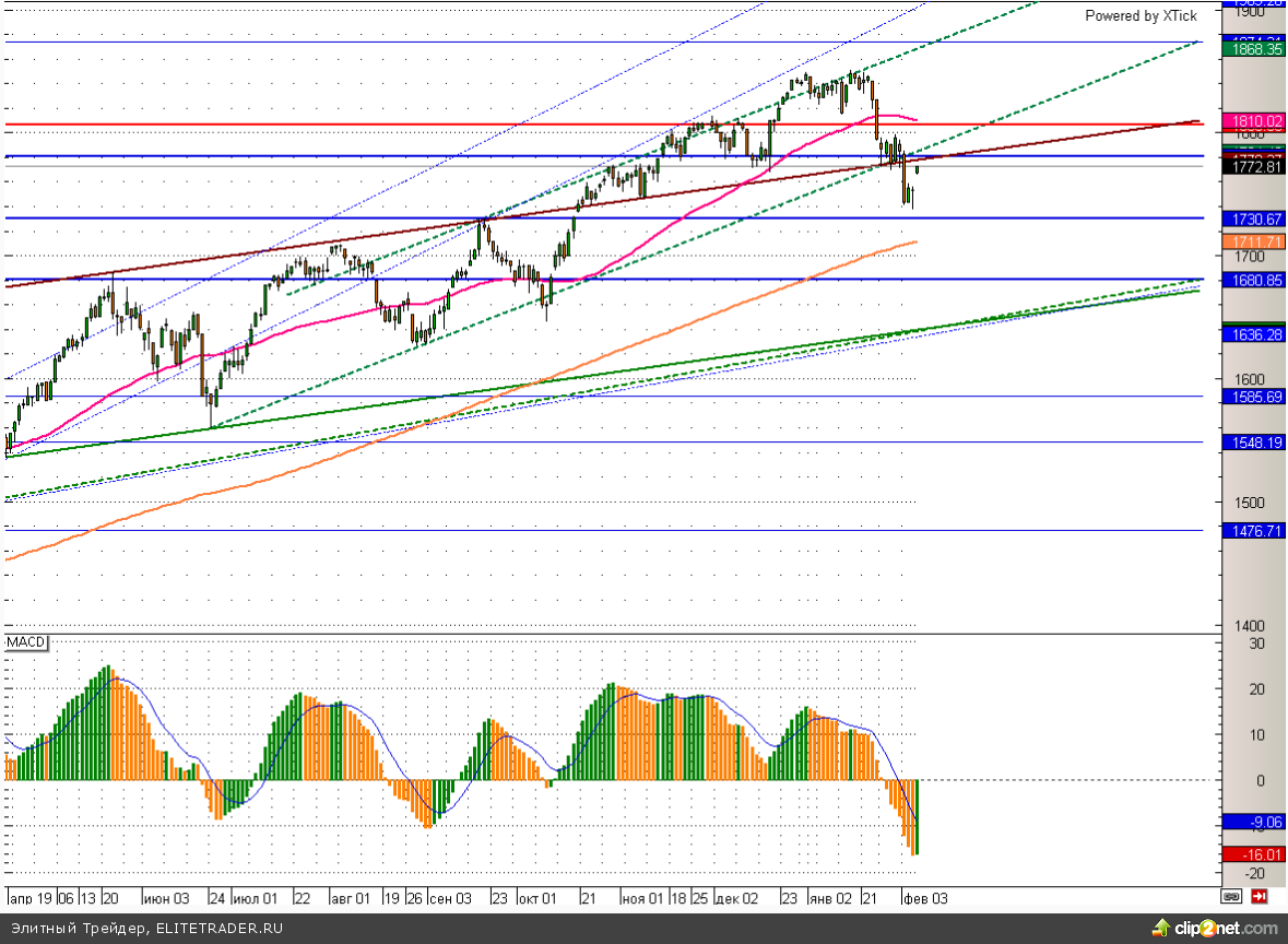 Индекс SnP500 сейчас тестирует снизу вверх недавно пробитое значимое сопротивление на уровне 1780. Преодолеть такой данную отметку без дополнительных драйверов будет крайне непросто, поэтому скорее всего в ближайшее время мы увидим некоторую коррекцию к росту последних дней.