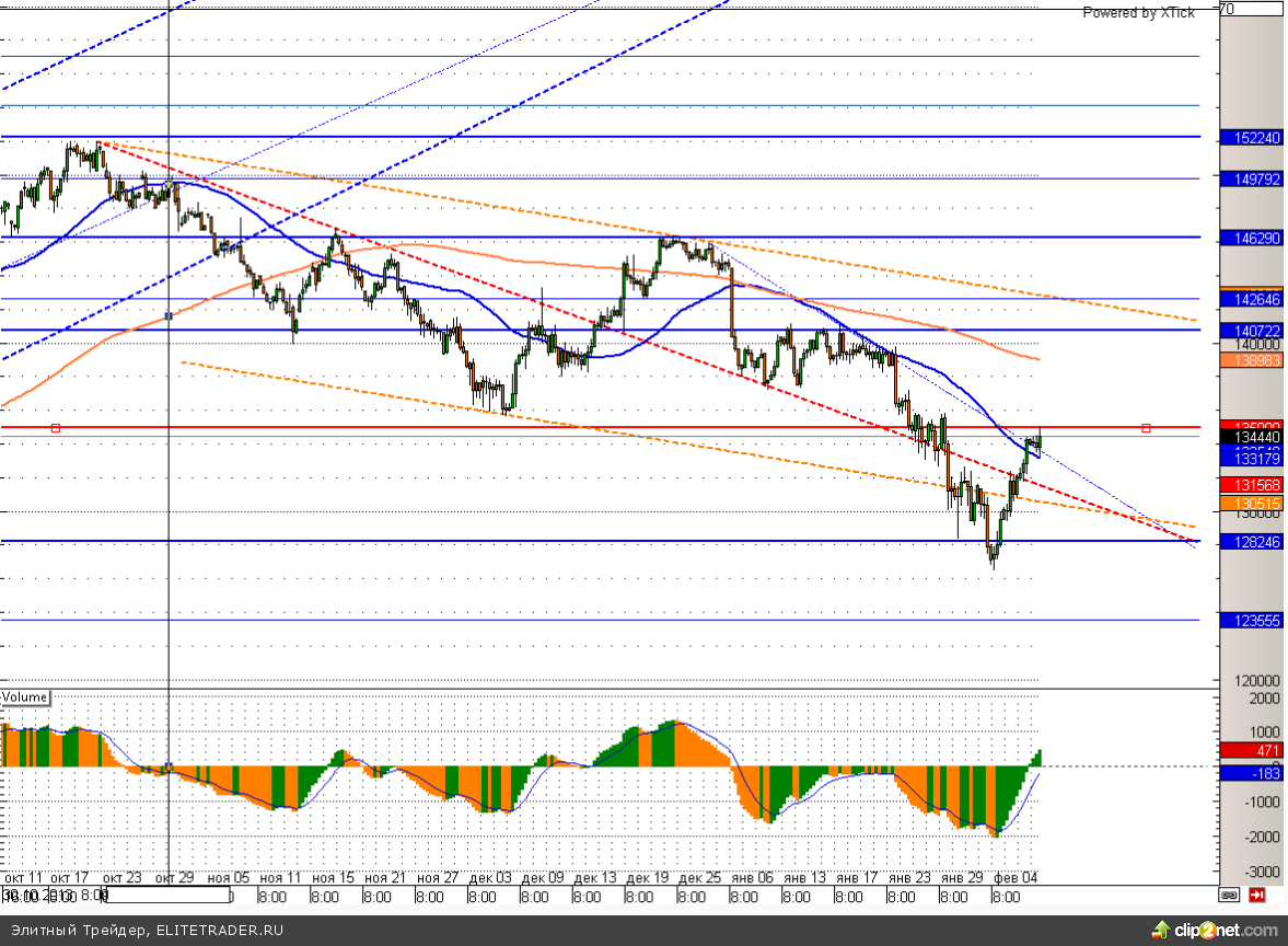 Фьючерс на индекс РТС сегодня снова растет, прибавляя более 0,5%.Данная динамика обусловлена высокими ценами на нефть и желанием участников продолжить восходящий тренд, наметившийся в последние несколько дней. На этом фоне RIH4 сегодня достиг своего ключевого сопротивления вблизи отметки 135000 и может немного скорректироваться вниз.