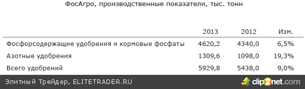 ОАО ФосАгро опубликовало производственные результаты за 2013 г. Объем производства удобрений увеличился на 9% г/г до 5,9 млн тонн. Прирост произошел в основном за счет азотного сегмента. Таким образом, производство фосфорсодержащих удобрений и кормовых фосфатов выросло на 6,5% г/г до 4,62 млн тонн, а объем выпуска азотных удобрений увеличился на 19,3% г/г до 1,31 млн тонн. Стоит отметить, что цены на азотные удобрения частично восстановились в 4кв13 и способны поддержать выручку компании по итогам года.