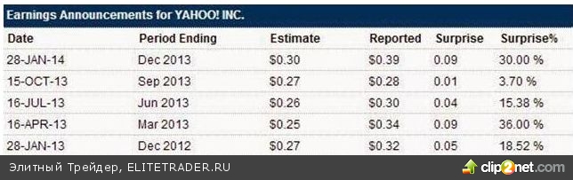 28/01/2014 - Yahoo предоставила квартальную отчетность после закрытия. Акции Yahoo упали более 8%, потянув за собой технологический сектор, добавляя к падению рынка основанное на заседании ФРС. Падение акций происходило не смотря на то что компания отчиталась с прибылью 0,46$ на акцию, что больше чем мнение аналитиков 0,39$. Причиной снижения стал результат объем продаж, который оказался ниже аналитиков. Заявление руководства по поводу прогнозов на 2014 год разочаровало инвесторов.