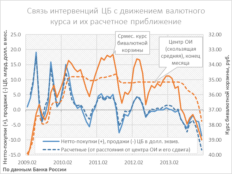 Поскольку реальный ход торгов (в частности, моменты выставления лотов ЦБ и их воздействие на валютный рынок) при имитации МТС банка России на домашнем компьютере обычно неизвестны, можно воспользоваться ее статистической моделью. Если фитить интервенции «в лоб» по отклонению среднемесячного курса от положения центра ОИ в конце месяца, то детерминация получается тоже не слишком высокой. Но если еще учесть скорость смещения центра ОИ в течение месяца, возможно, «поглотившего» значительную часть интервенций, то приближение выходит очень хорошим (оно показано синим пунктиром на верхнем графике, отклонения связаны с изменениями параметров алгоритма ЦБ в периоде оценки – март 2009-январь 2014, тогда как из регрессии временной тренд я сознательно убрал). Видим, что, как и заявлял ЦБ, никаких целей по удержанию какого-либо конкретного курса в его работе на валютном рынке нет и не было, а «автопилот» интервенцией действительно лишь сглаживал случайные «рыскания» курса.