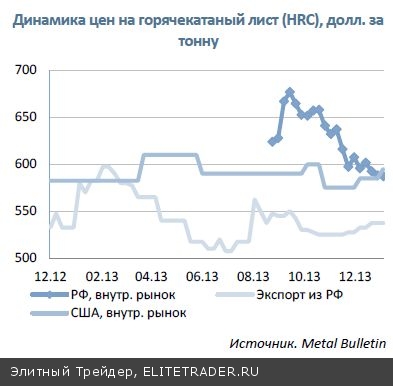 По данным компании, средняя цена реализации продукции на внутреннем рынке России снижалась практически непрерывно на протяжении последних 2,5 лет: с 914 долл. за т в 2К11 до 637 долл. за т в 3К13. За этот же период себестоимость производства сляба снизилась с 495 долл. /т до 363 долл./т.