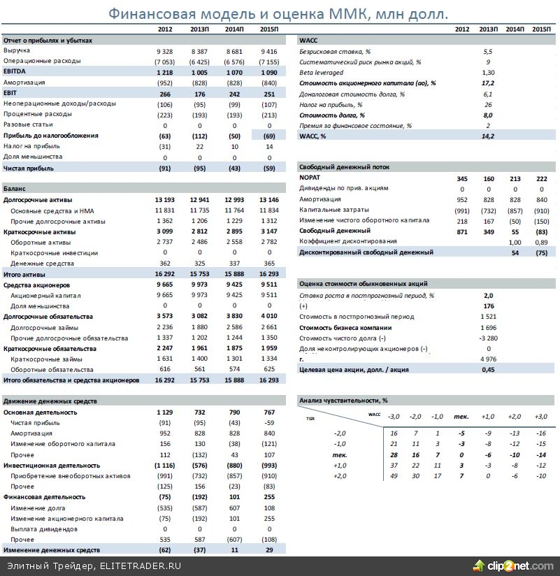Мы обновили оценку акций ММК с использованием метода дисконтированных денежных потоков (DCF) и понизили целевую цену акций компании с 0,5 долл. до 0,45 долл., сохранив при этом рекомендацию «Покупать». Основной причиной пересмотра оценки стало понижение прогноза выручки в 2014 г. на 4,7%. В рамках оценки мы исходим из того, что объем спроса на стальную продукцию в России в 2014 г. сохранится на уровне предыдущего года, а среднегодовая цена на плоский прокат составит 550 долл. за т HRC. Мы ожидаем, что выручка ММК по итогам 2013 г. составит 8,38 млрд долл., а EBITDA 1 млрд долл., а соответствующие показатели в 2014 г. составят 8,68 млрд долл. и 1,07 млрд долл.