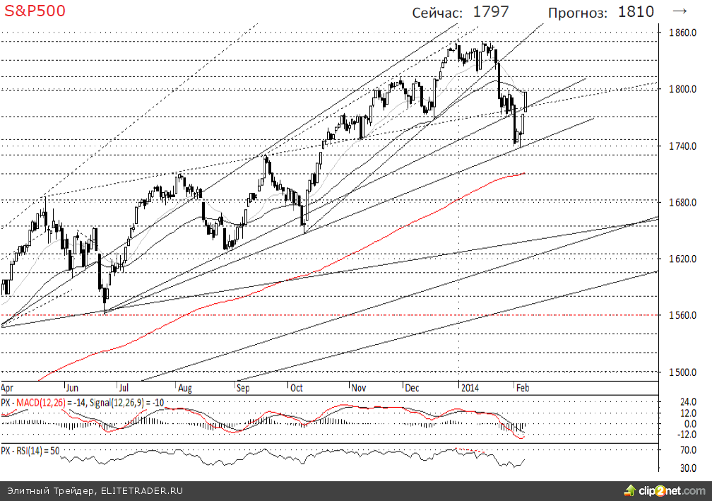 Индекс SnP500 начал неделю с резкого падения, пробив локальный минимум начала ноября, но остановился на линии восходящего тренда через минимумы второго полугодия 2013. Позиционная борьба за эту линию продолжалась в следующие две сессии, а во второй половине недели индекс развернулся вверх и все потери отыграл (1797,02 пунктов, +0,81%)