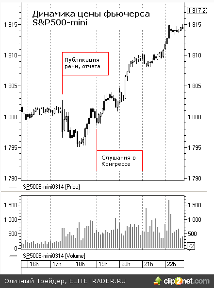 Нужно сказать, что в момент публикации сама заготовленная речь не вызвала у участников рынка позитивных эмоций, что видим в отражении динамики самого ликвидного инструмента - фьючерса на индекс SnP500-mini, но с открытием NYSE ситуация стала выравниваться в преддверие слушаний, в ходе которых рост все больше набирал обороты.
