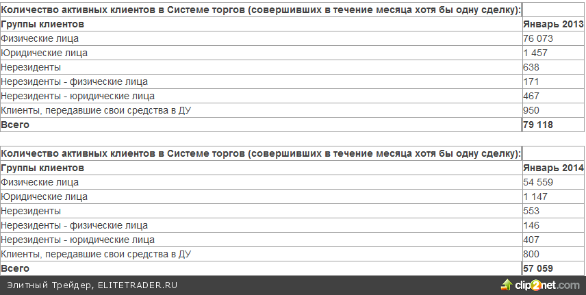 Всего за год. С января 2013 года по январь 2014 года количество активных клиентов Москвоской биржи сократилось с 79 тыс. до 57 тыс. На 22 тысячи человек. За год. За один год. На 28%. На треть. Это лучшая возможность еще поднять цены?