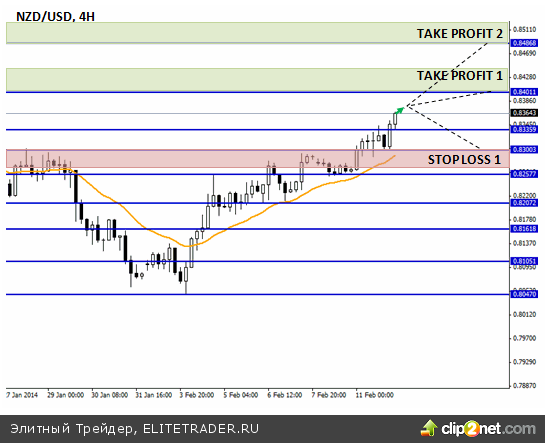 Если говорить о фундаментальных факторах, то тут, конечно, ключевую роль в росте киви играет тот факт, что от РБНЗ в текущем году ожидают повышение процентной ставки на фоне ускорения темпов роста экономики и инфляции (напомним, что на январском заседании РБНЗ сохранил ставку на прежнем уровне, но при этом председатель Грэм Уилер отметил достаточно высокие темпы экономического роста и цены на экспортные товары, в частности, на молочную продукцию). Соответственно, вероятность повышения ставки в скором времени весьма существенна. И это делает его более привлекательным не только по отношению, например, к евро (монетарный совет ЕЦБ время от времени возвращается к обсуждению введения дополнительных монетарных стимулов), но и по отношению к доллару (а ведь ФРС уже движется в направлении сокращения количественного стимулирования, хотя последние события, вероятно, сдержат начало более агрессивных действий в этом направлении). Возможно, что подтолкнуть РБНЗ к более быстрому началу ужесточения монетарной политики помимо уже названных факторов, сможет перегрев рынка недвижимости. Но на пути роста пары есть препятствие в виде довольно сильного сопротивления 0,84, для прорыва которого потребуются катализаторы. Вероятно, что в качестве таковых выступят запланированные к публикации экономические отчеты.
