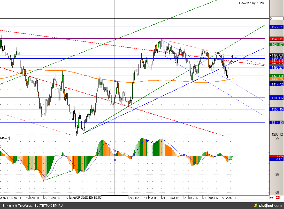 Российский рынок завершил торговую сессию среды на положительной территории. При этом ММВБ преодолел отметку 1485, где проходит в данный момент нисходящая трендовая линия. Поэтому движение вверх в скором времени вполне может продолжиться.