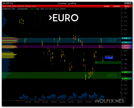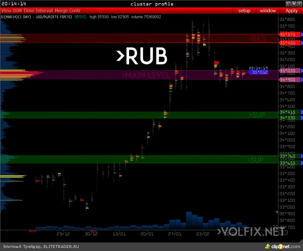 Еще немного и мы бы увидели 36-у, но сверх ликвидность на максимуме, пока приостановила ослабление рубля. Этот уровень точно стоит отметить, скорее всего НБ вмешался в это время и будет контролировать этот ценовой диапазон. Один раз мы такое уже видели но по другим ценам – около 7 раз не пускали котировку и контракт просто стоял у этого уровня. Сейчас уже 5-ый день фьючерс застыл в ожидании. Обратите внимание на 35200 – если этот объем пройдет рубль – мы увидим еще одну попытку атаки 35500.