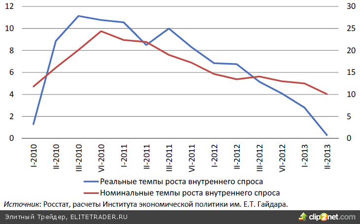После восстановительного роста, достигнув предкризисного уровня ВВП и промышленного производства, темпы роста основных макропоказателей РФ стали устойчиво снижаться начиная с середины 2012 г. Позитивный внешний фон, прежде всего сохранение мировых цен на нефть выше 100 долл./барр., предотвратил падение выпуска национальной экономики. Тем не менее темпы роста внутреннего спроса (рассчитываемого как ВВП по потреблению минус экспорт плюс импорт) замедлялись как в номинальном, так и в реальном выражении.